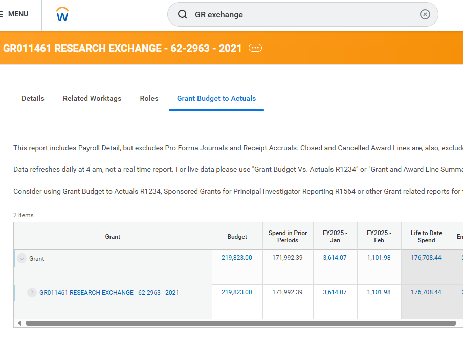 One of the most simple ways to see the current budget and spend on your Grant is to simply type in the GR# of the grant in the search bar of workday and select the grant. There are four tabs (details, related worktags, roles, and “Grant Budget to Actuals”. This embedded report will show a PI their budget, spend, and encumbrances.
